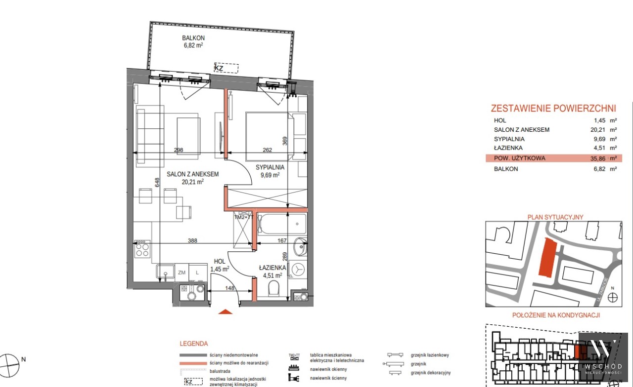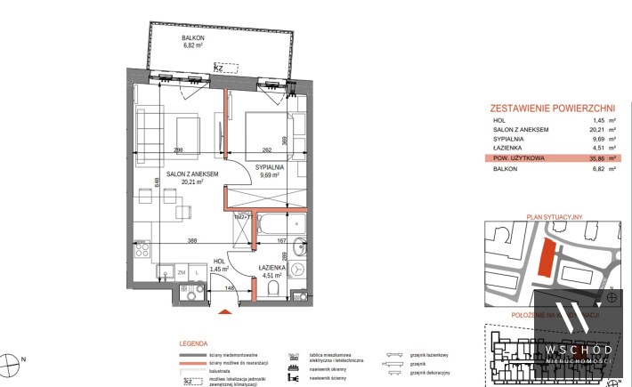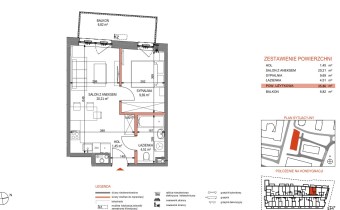 Mieszkanie składające się z salonu z aneksem kuchennym, sypialni, przedpokoju, łazienki oraz balkonu