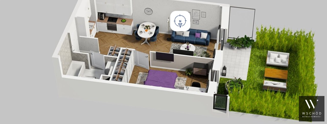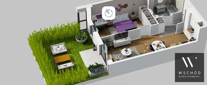 Mieszkanie składające się z salonu z aneksem kuchennym , sypialni, łazienki oraz ogródka