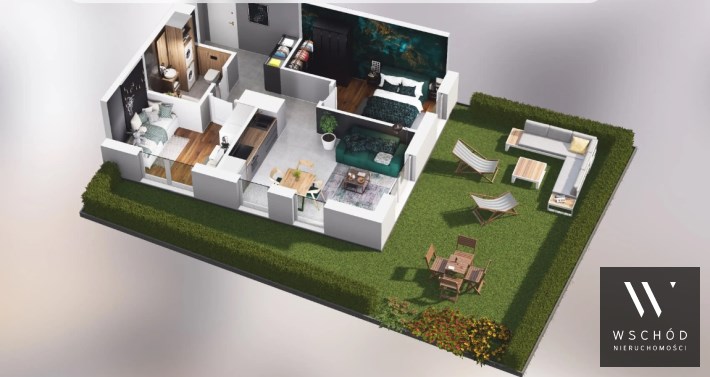 Mieszkanie składające się z salonu z aneksem kuchennym, dwóch sypialni, przedpokoju, łazienki oraz narożnego ogródka o pow. 71m2