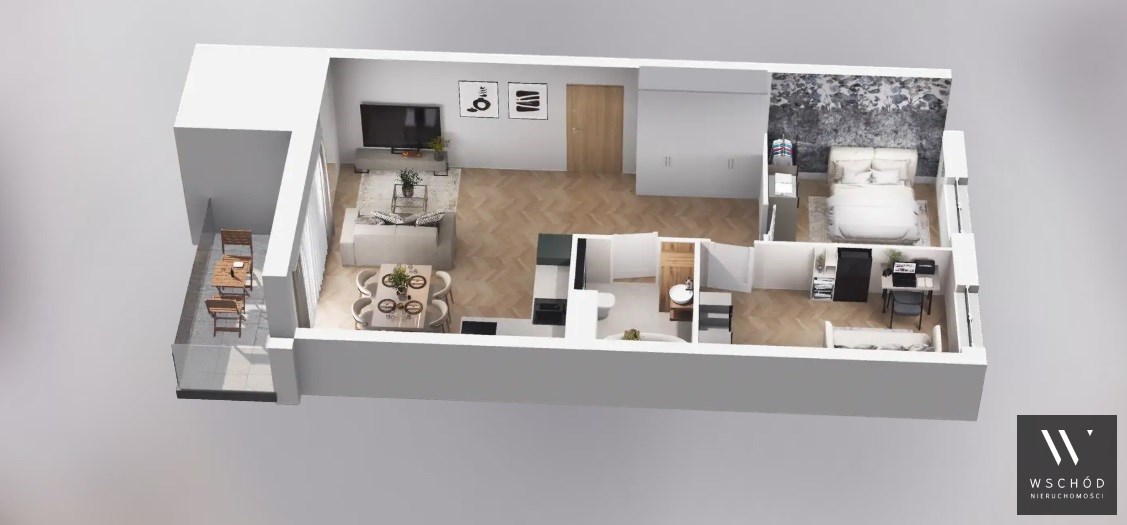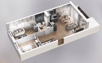 Mieszkanie składające się z salonu z aneksem kuchennym, dwóch sypialni, przedpokoju, łazienki oraz ogródka