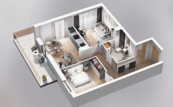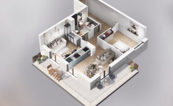 Mieszkanie składające się z salonu z aneksem kuchennym, dwóch sypialni, przedpokoju, łazienki oraz balkonu o pow. 15m2