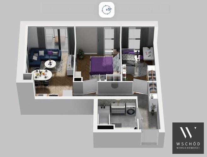 Mieszkanie składające się z pokoju z aneksem kuchennym , dwóch sypialni, łazienki oraz balkonu.