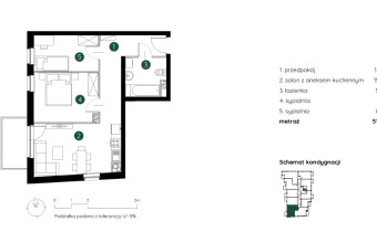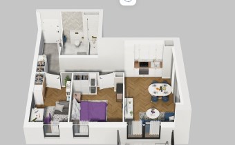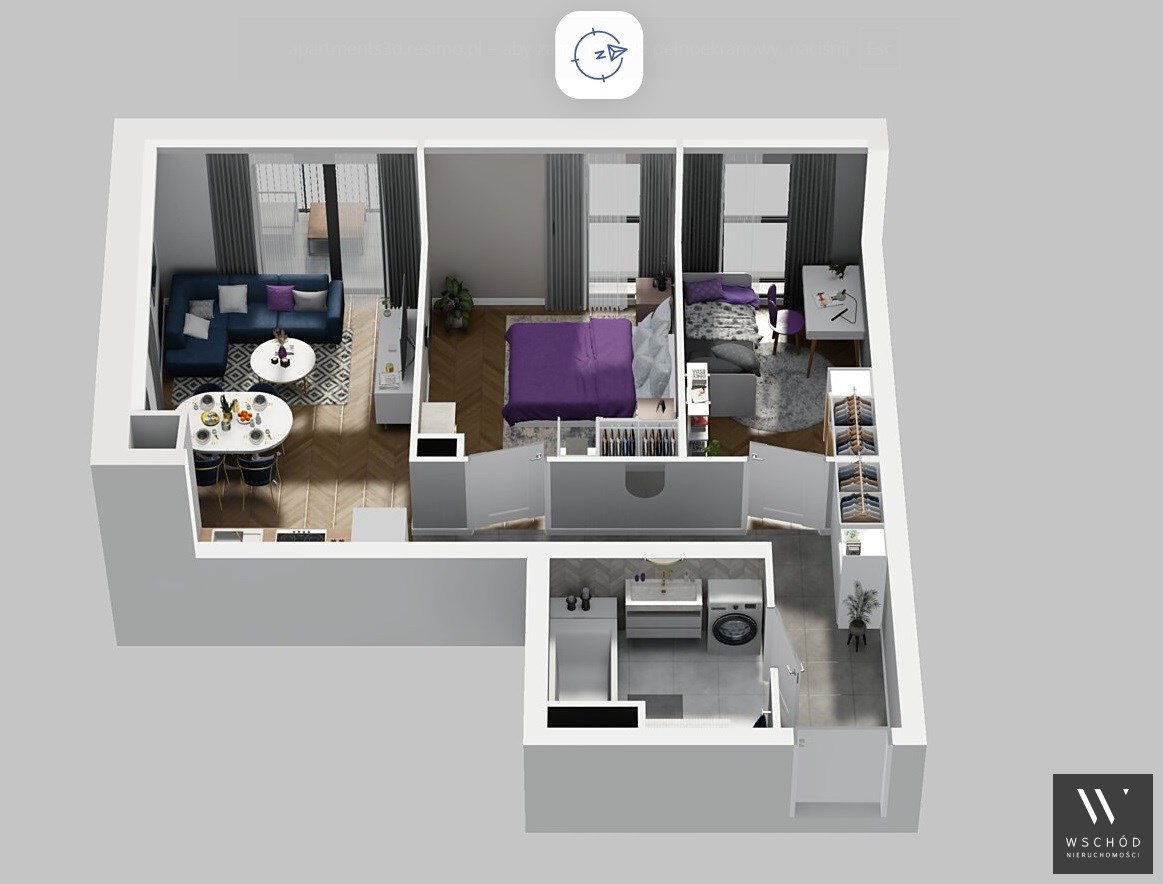 Mieszkanie składające się z pokoju z aneksem kuchennym , dwóch sypialni, łazienki oraz balkonu.