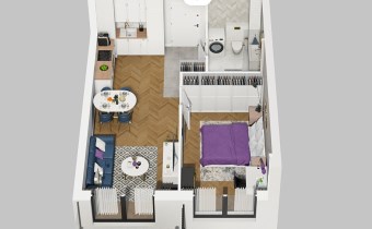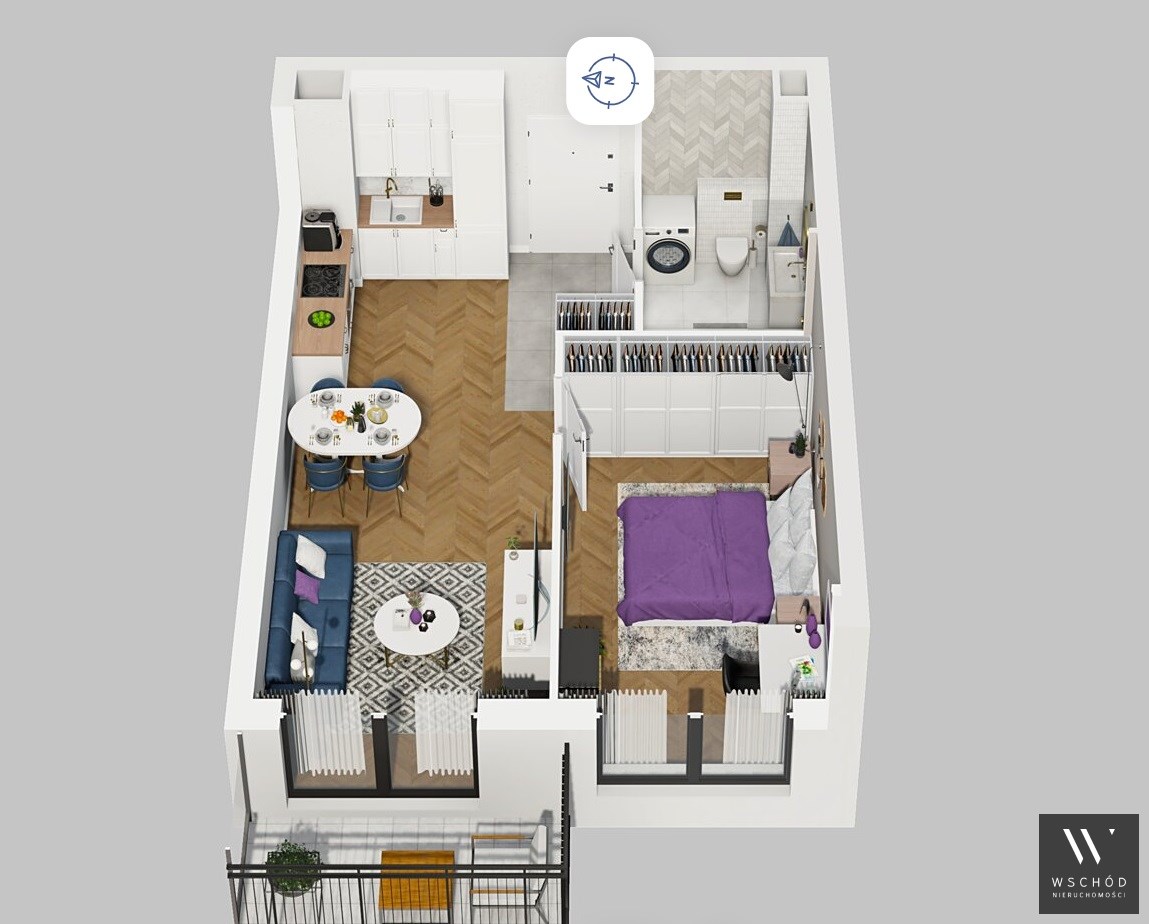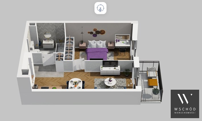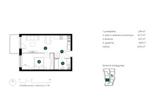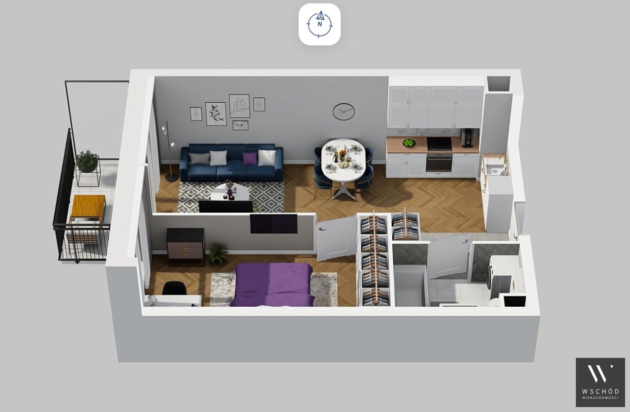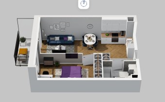 Mieszkanie składające się z pokoju z aneksem kuchennym , sypialni, łazienki oraz balkonu.