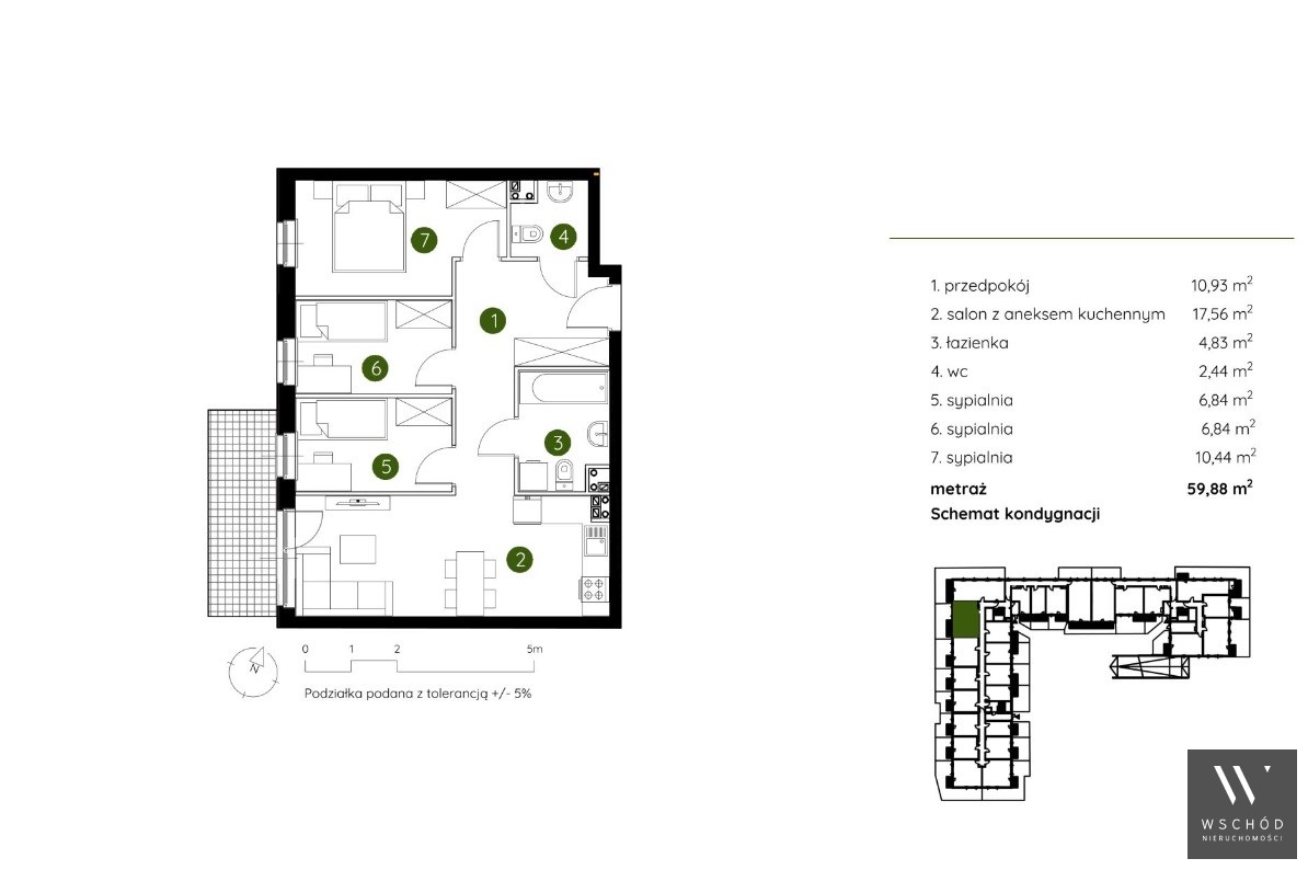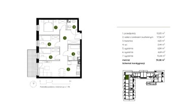 Mieszkanie składające się z salonu z aneksem kuchennym , trzech sypialni, przedpokoju, łazienki, WC oraz ogródka o pow. 29m2