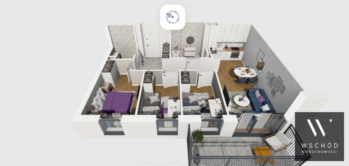 Mieszkanie składające się z salonu z aneksem kuchennym , trzech sypialni, przedpokoju, dwóch łazienek oraz balkonu.