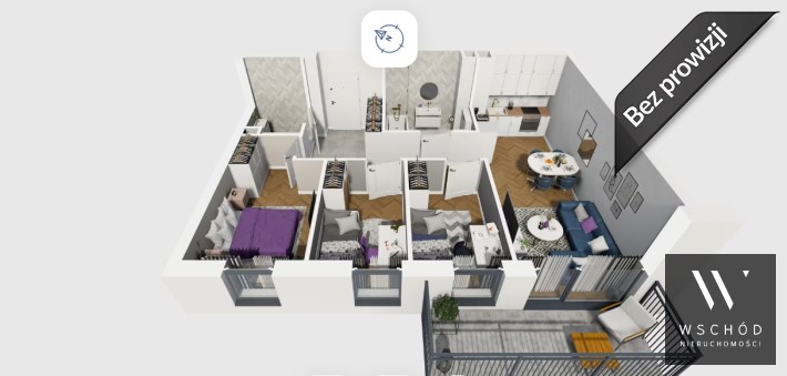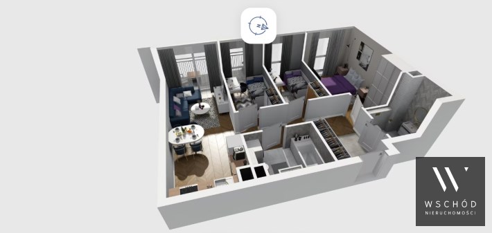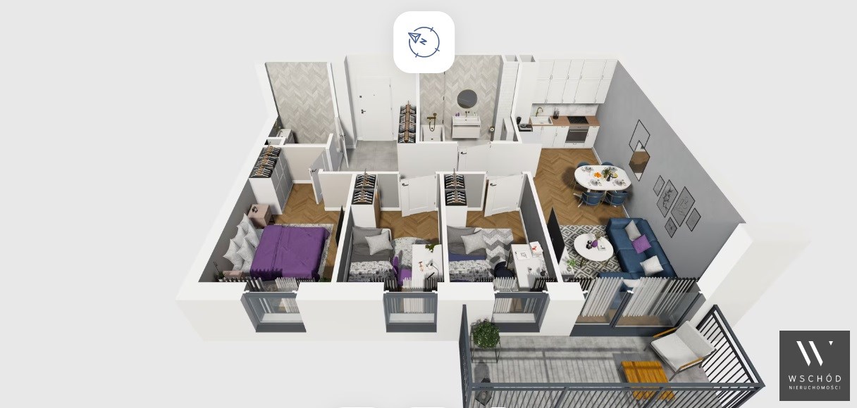Mieszkanie składające się z salonu z aneksem kuchennym , trzech sypialni, przedpokoju, dwóch łazienek oraz balkonu.
