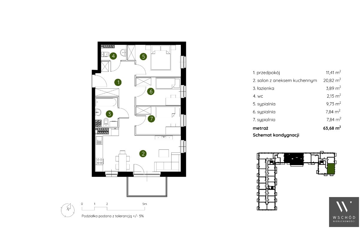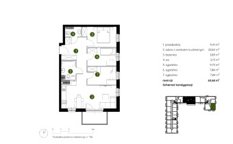 Mieszkanie składające się z salonu z aneksem kuchennym , trzech sypialni, przedpokoju, łazienki, WC oraz balkonu.