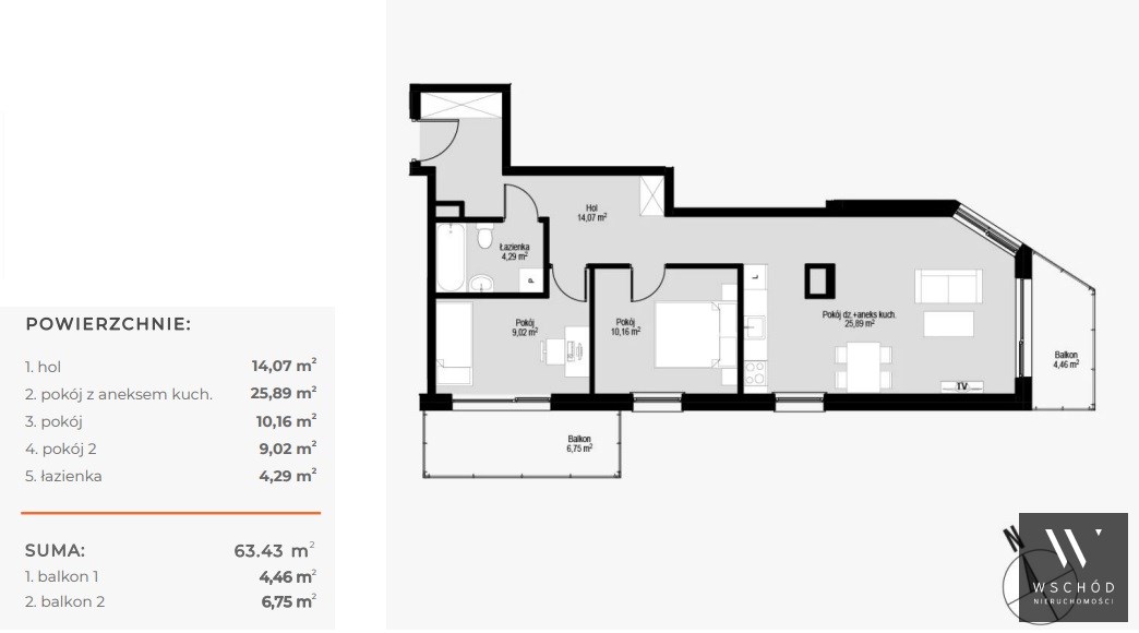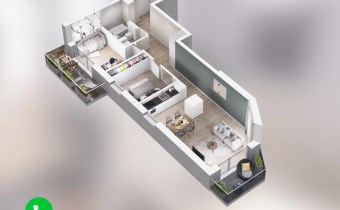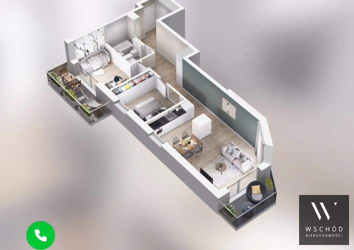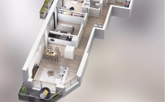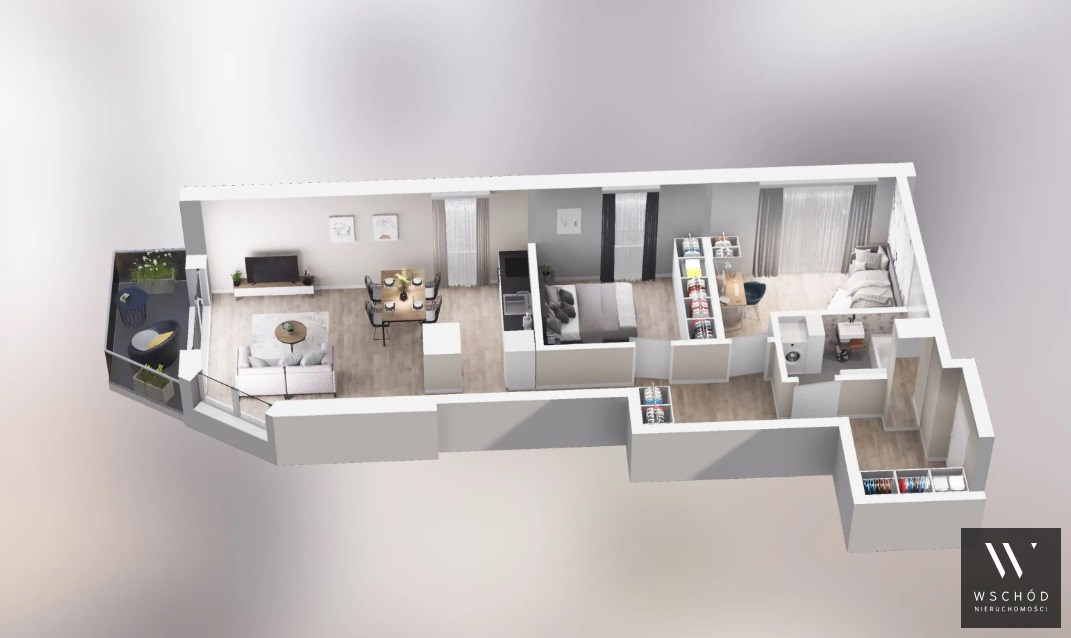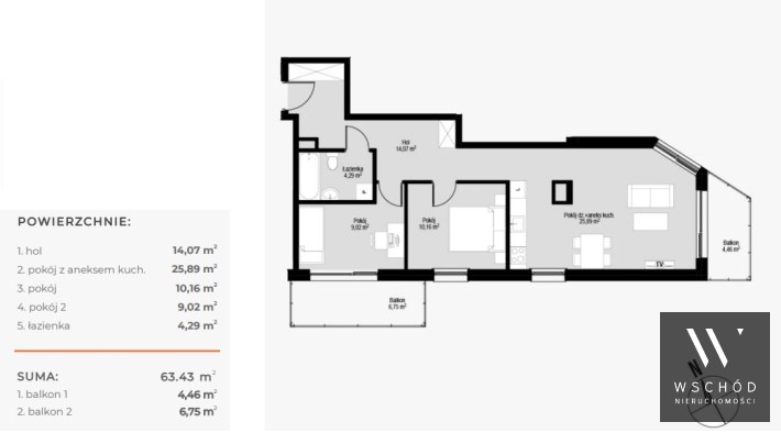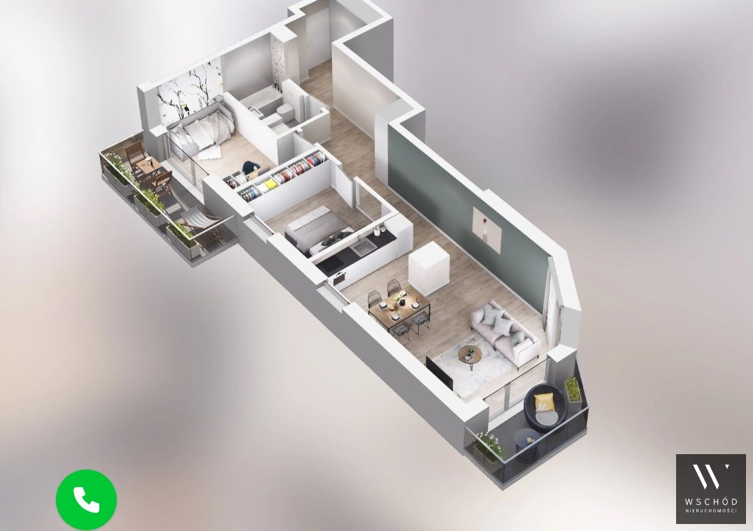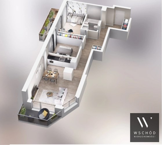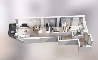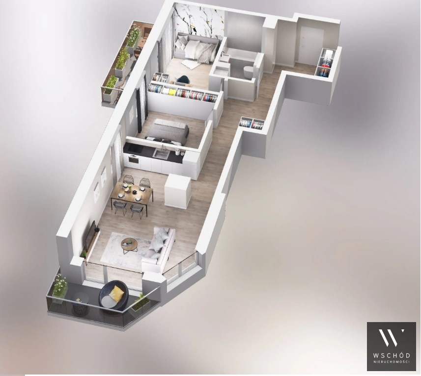 Mieszkanie składające się z salonu z aneksem kuchennym, dwóch sypialni, przedpokoju, łazienki oraz dwóch balkonów