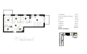 Mieszkanie składające się z salonu z aneksem kuchennym , trzech sypialni, przedpokoju, łazienki, WC oraz dwóch balkonów