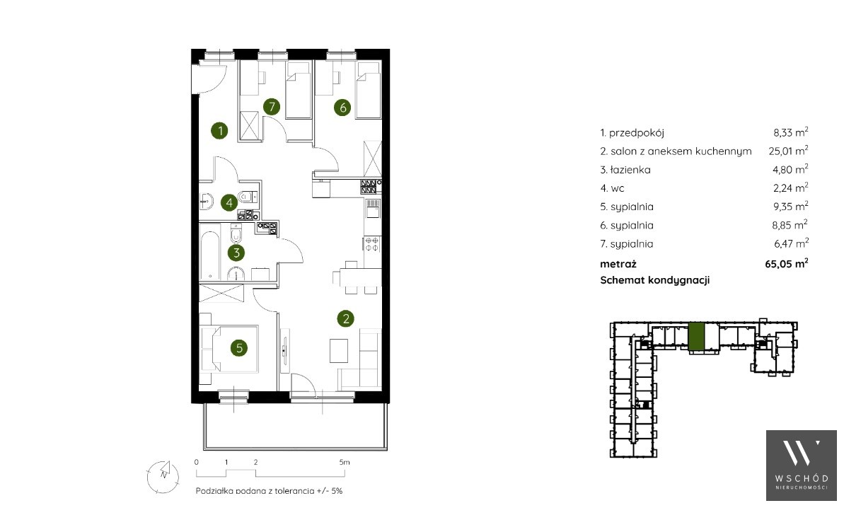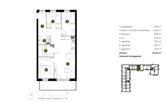 Mieszkanie składające się z salonu z aneksem kuchennym , trzech sypialni, przedpokoju, łazienki, WC oraz balkonu