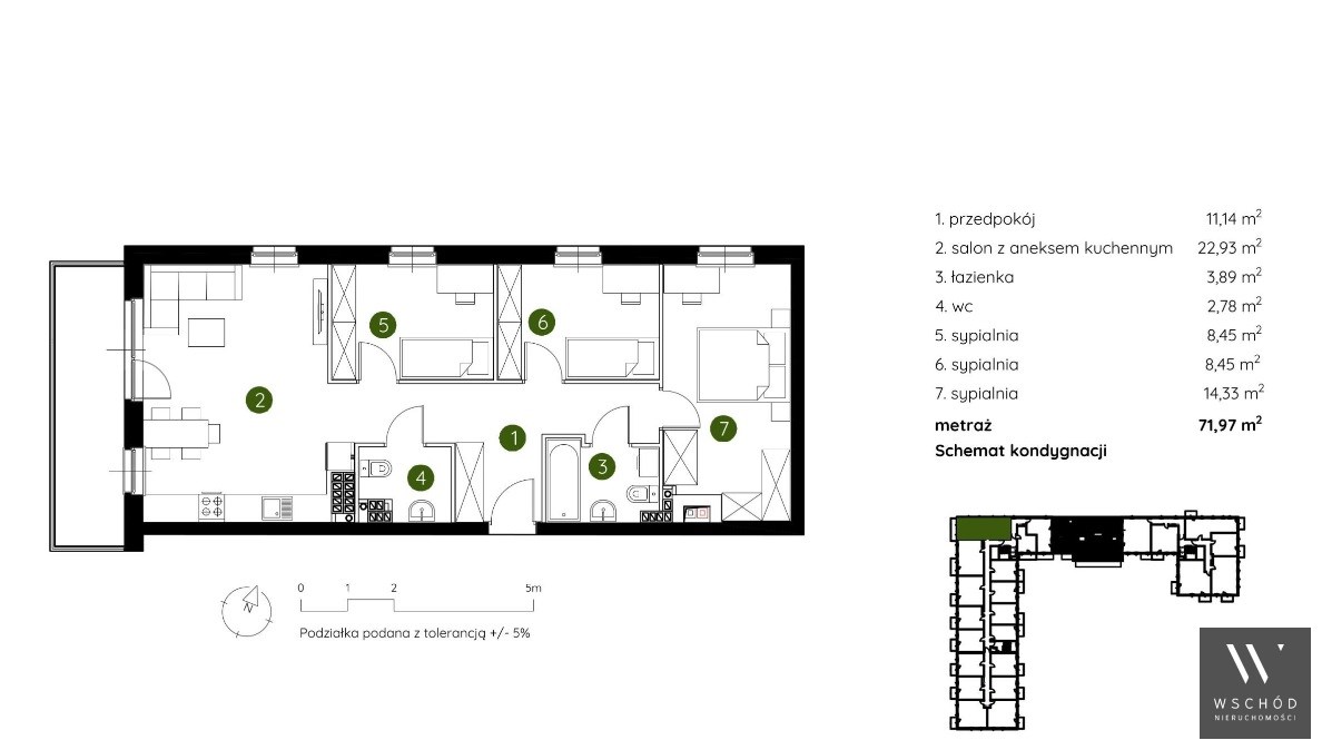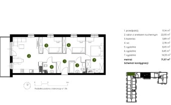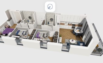 Mieszkanie składające się z salonu z aneksem kuchennym , trzech sypialni, dwóch łazienek, przedpokoju, oraz balkonu