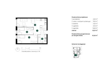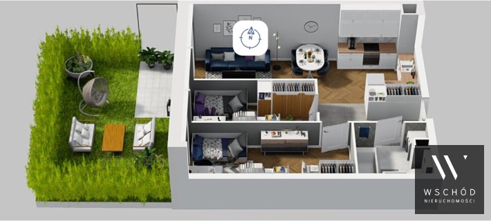 Mieszkanie składające się z salonu z aneksem kuchennym , dwóch sypialni, przedpokoju, łazienki oraz ogródka.