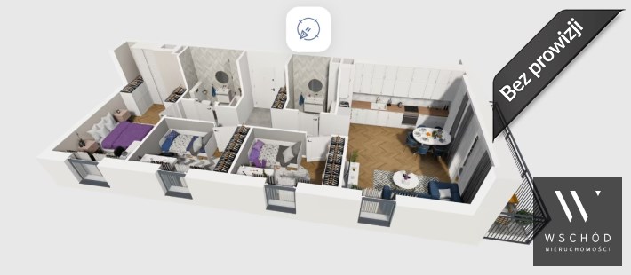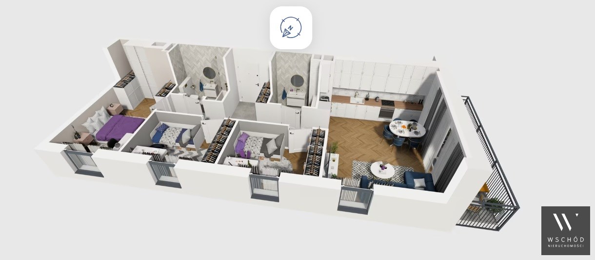 Mieszkanie składające się z salonu z aneksem kuchennym , trzech sypialni, dwóch łazienek, przedpokoju, oraz balkonu