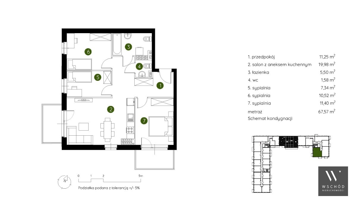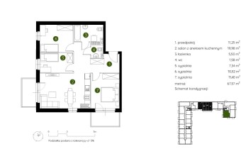 Mieszkanie składające się z salonu z aneksem kuchennym , trzech sypialni, przedpokoju, łazienki, WC oraz dwóch balkonów