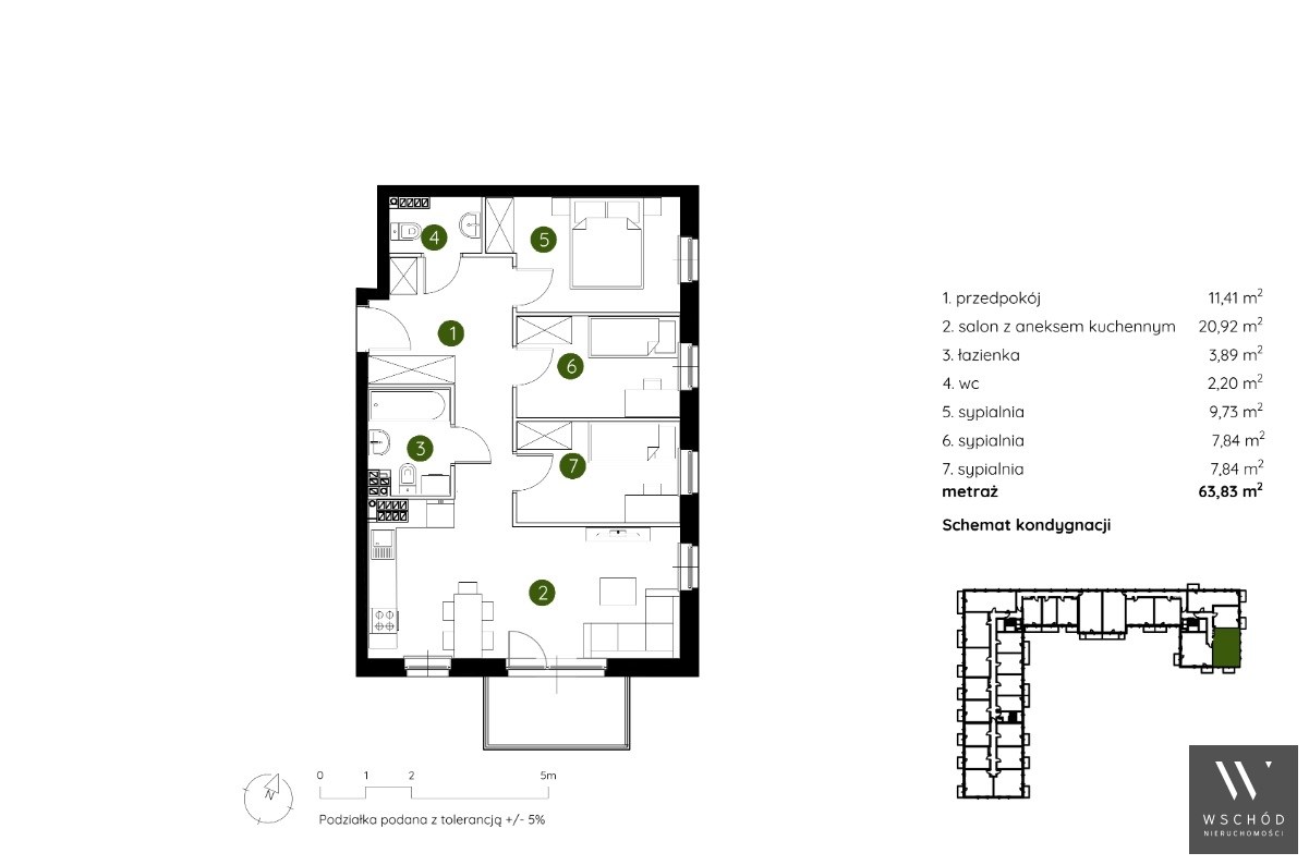 Mieszkanie składające się z salonu z aneksem kuchennym, trzech sypialni, przedpokoju, łazienki , WC oraz balkonu