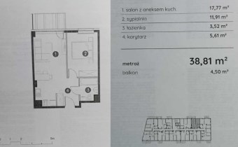 Mieszkanie składające się z salonu z aneksem kuchennym, sypialni, przedpokoju, łazienki oraz balkonu.